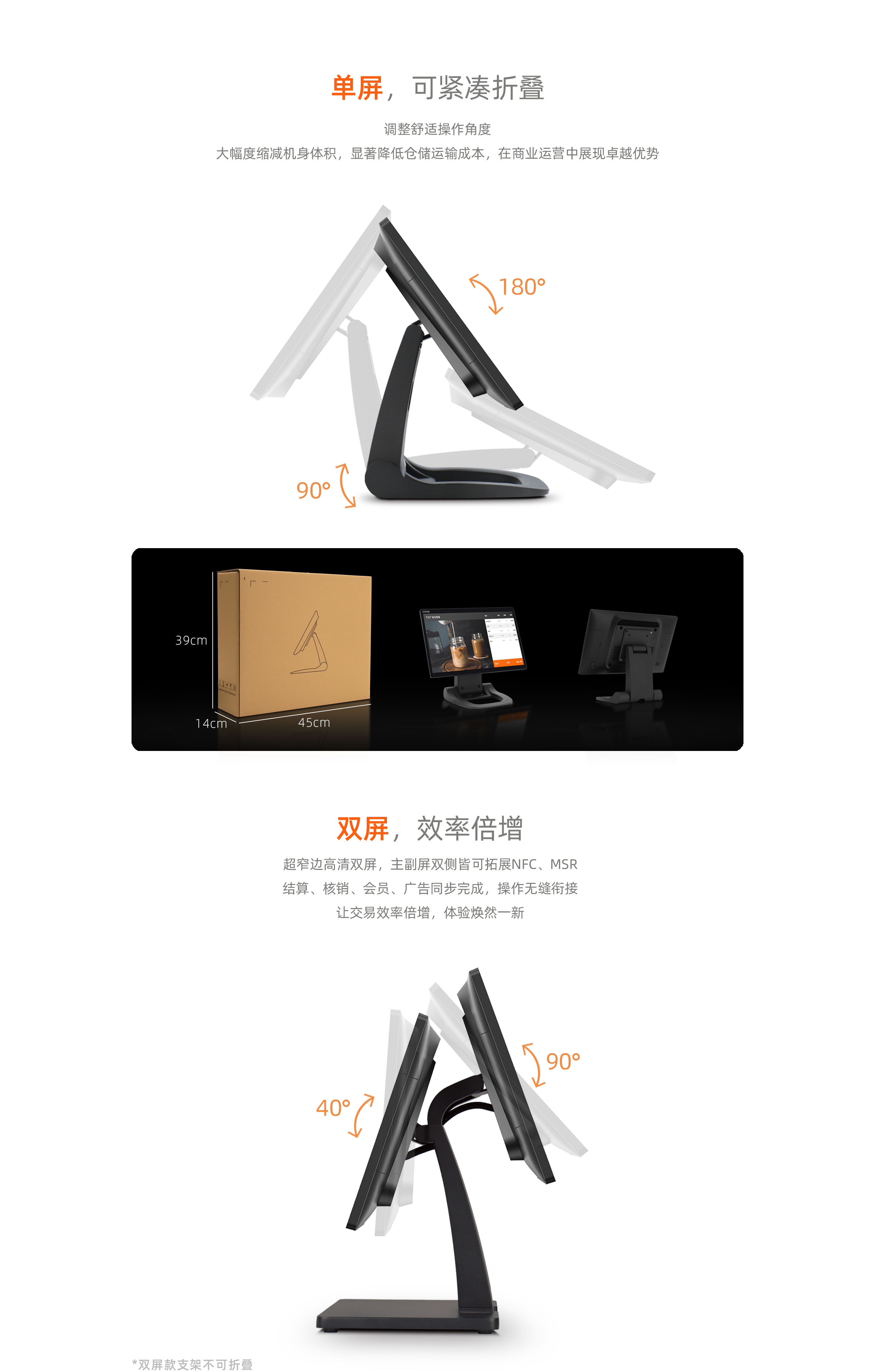 T2w Lite 超薄桌面收银机,延续T2系列纤薄美学,以30mm轻盈机身重塑空间效率。配备15.6英寸7mm窄边大屏,支持单屏灵活折叠收合,适配空间多变场景。可选配双高清屏形态,机身预留丰富扩展接口,支持外接设备灵活拓展,为高效运营提供轻量而完整的智能收银解决方案。